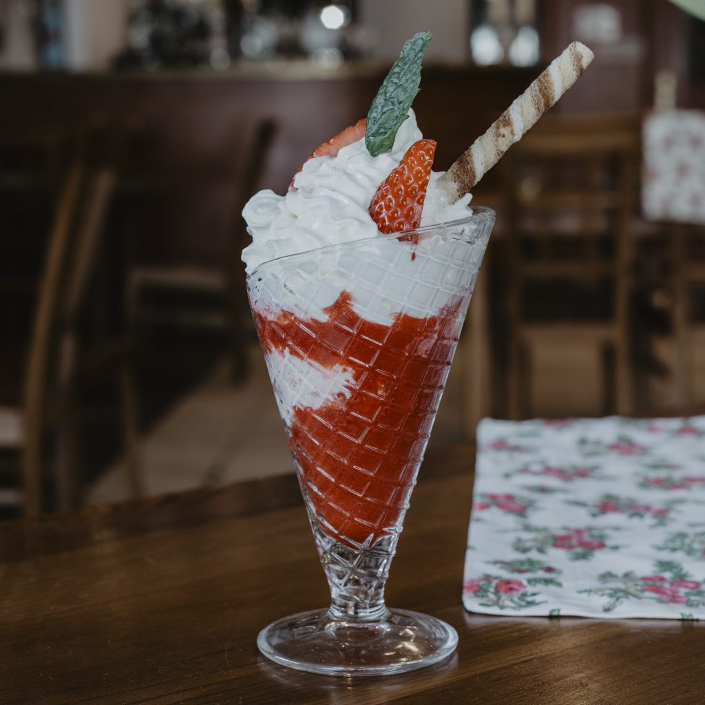 Truskawkowa fantazja lody truskawkowe i waniliowe, mus truskawkowy, bita śmietana Bakaliowe marzenie lody waniliowe i bakaliowe, bakalie, adwokat, bita śmietana, polewa czekoladowa Magiczne Tiramisu lody tiramisu, biszkopty, amaretto, bita śmietana, polewa czekoladowa Puchar lodowy trzy gałki lodów, bita śmietana, owoce, polewa Miś uszatek deser dla dzieci: dwie gałki lodów, bita śmietana, owoce