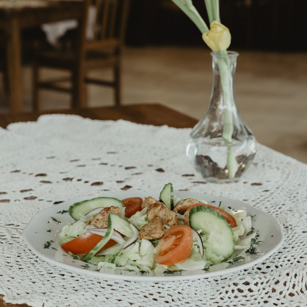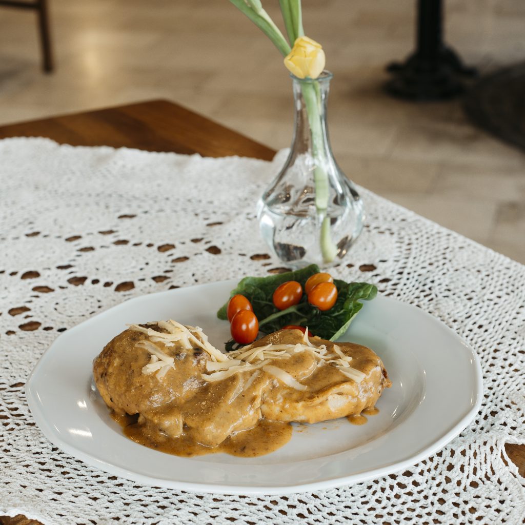 Placki ziemniaczane z gulaszem Placki ziemniaczane z sosem grzybowym Placki ziemniaczane z kwaśną śmietaną Kotlet po krakowsku Kotlet schabowy Kotlet de Volaille Indyk z żurawiną Kurczak w sosie gorgonzola Polędwica wołowa w boczku z sosem z zielonego pieprzu Sztuka mięsa w sosie czosnkowym Eskalopki cielęce Kaczka pieczona z jabłkami